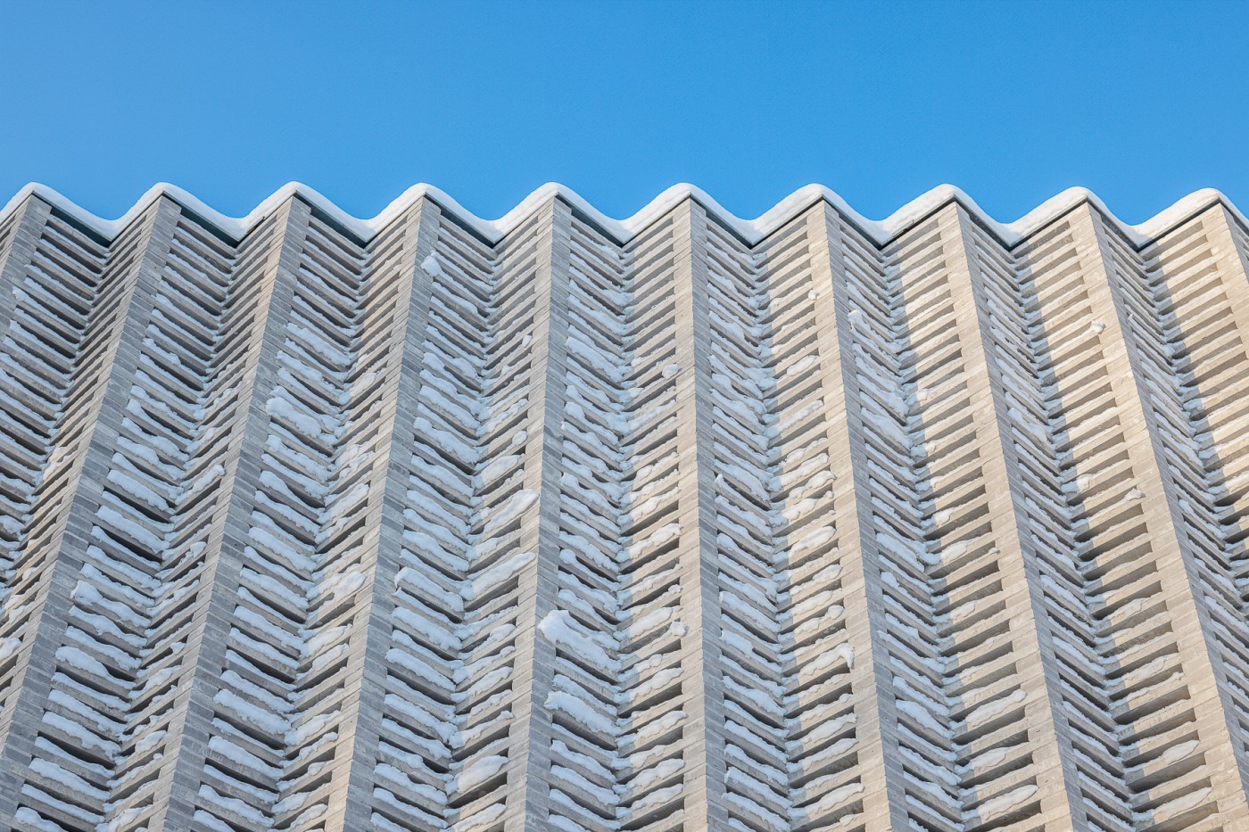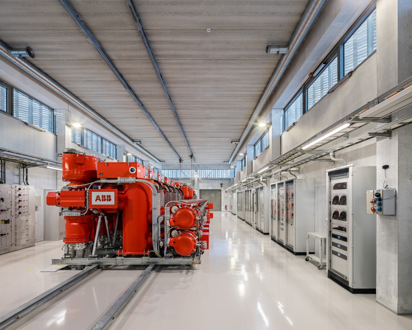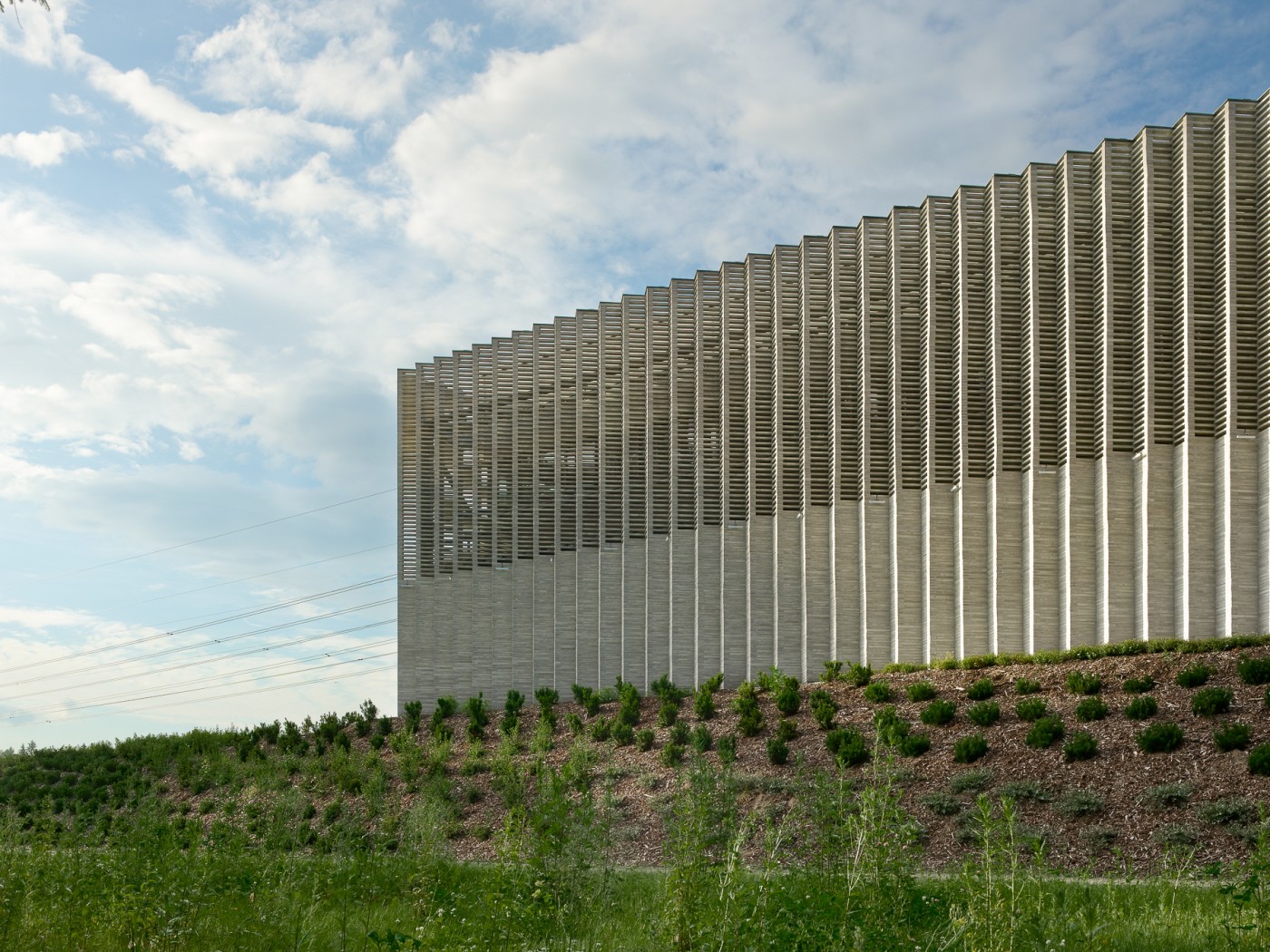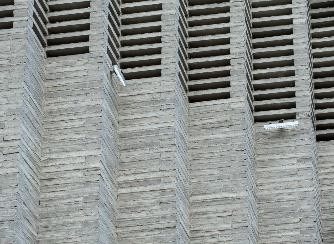 The substation building has a concrete frame and double-skin facades. The outermost facade layer consists of long hand-made bricks laid in a zig-zag profile, a motif that the building fronts share with the triangular steel profiles of the new powerline towers and terminals. The material choice is based on the beautiful brick claddings of the old hydropower plant. The top of the masonry wall consists of a porous lattice pattern that lets light and air pass through. The inner layer of the double facade consists of in-situ and prefabricated concrete walls cut by a strip window visible behind the brick lattice. An auxiliary steel frame supporting the brick walls is fixed to the concrete walls.