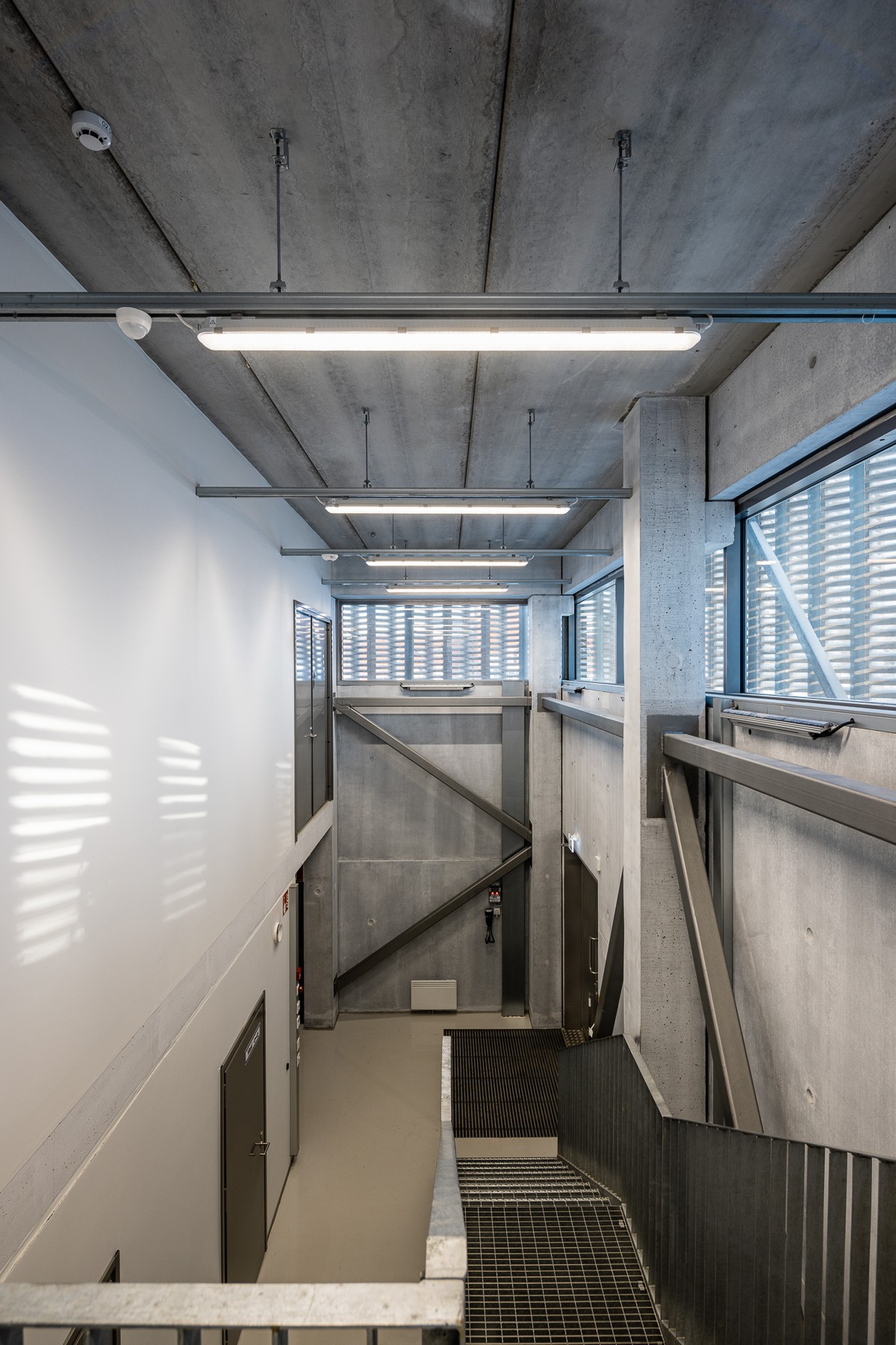 A double-height entrance lobby inside the building provides access to the main process space via a low corridor. Stairs to the machine room and basement can also be reached from here. The main process equipment room and the lobby receive natural light via the window strip on the inner concrete layer of the double-skin external walls.