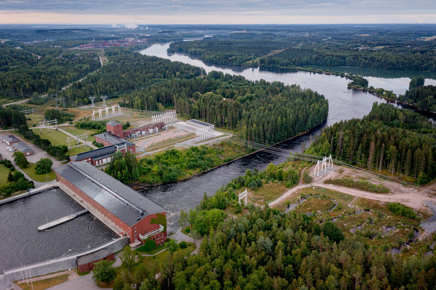 The project crosses two tributaries of the River Vuoksi. The design goal was to balance the new structures with the surrounding built and natural landscape. Except for one tall tower, the new transmission structures are lower in height than the surrounding treetops. The old hydropower plant buildings were the primary factors in the positioning and layout of the new structures. The substation building is partially underground, making it as low as the nearest section of the old power plant.
