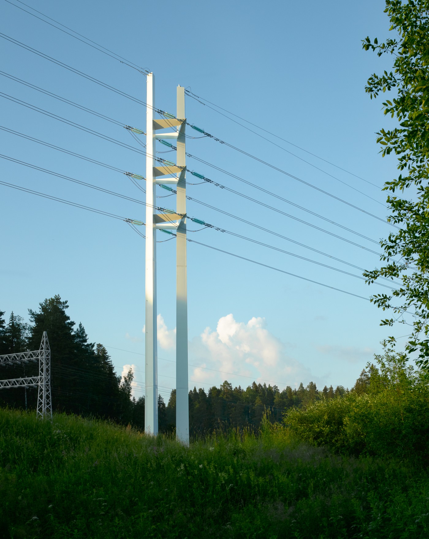 The project features three different types of transmission structures. Architectural and spatial in form, they are built of triangular welded steel profiles in repetitive configurations. The towers and terminals are similar in form and structural principles, although different in specific functions. They reference the colour and geometries of old lattice-type powerline pylons in light grey steel that exist in the area.