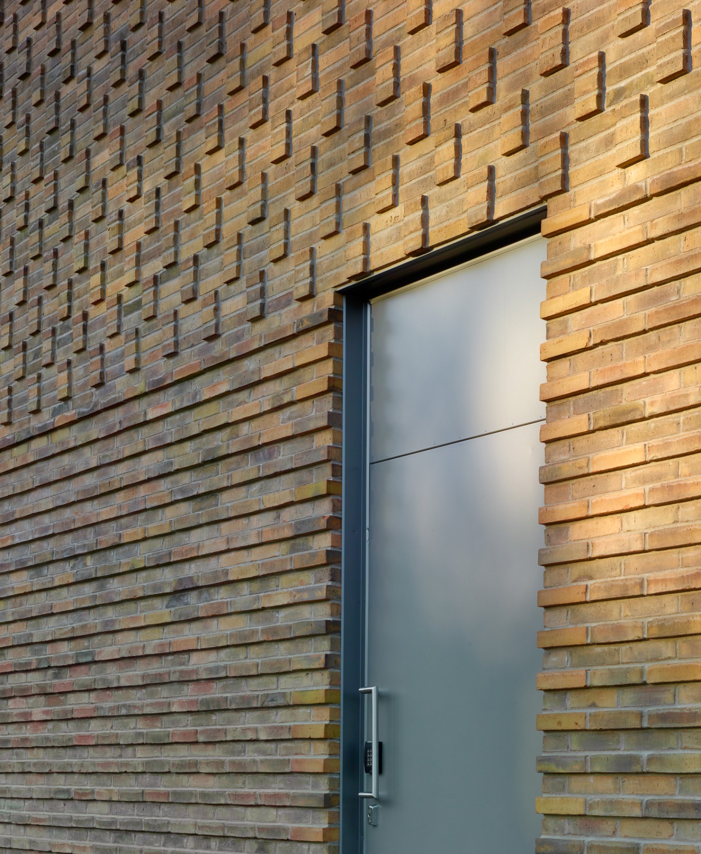 The switchgear building's brick cladding uses four masonry patterns, some laid as double-skin structures. The facades serve the interior spaces and allow light and air to pass through the double skin's porous latticework masonry where necessary. Successfully detailing the façades required 13 different types of custom-made bricks. On the double façade sections, the brick cladding is one metre away from the back wall, which is either glass or concrete.
